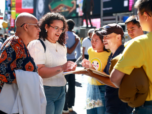 Many people of diverse backgrounds participated in the Times Square celebration, sharing their personal visions for peace. A. Kane, from New York City, shared, “It’s important to be transparent and have integrity and believe in world peace and focus on doing good things for the world.”